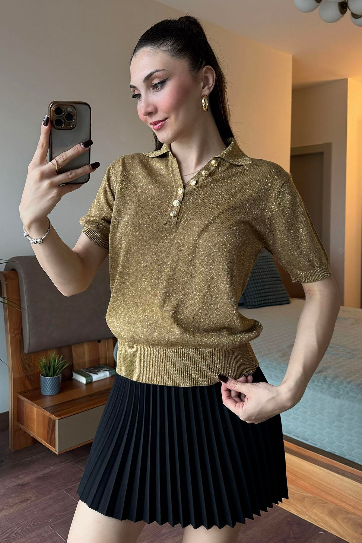 Altın Gold Düğmeli Polo Yaka Simli Triko Kazak