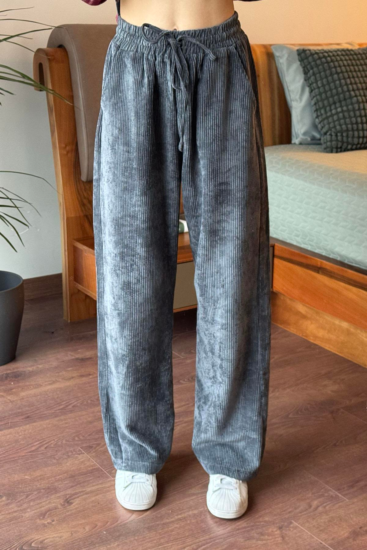 Antrasit Beli Lastikli Geniş Kesim Kadife Pantolon