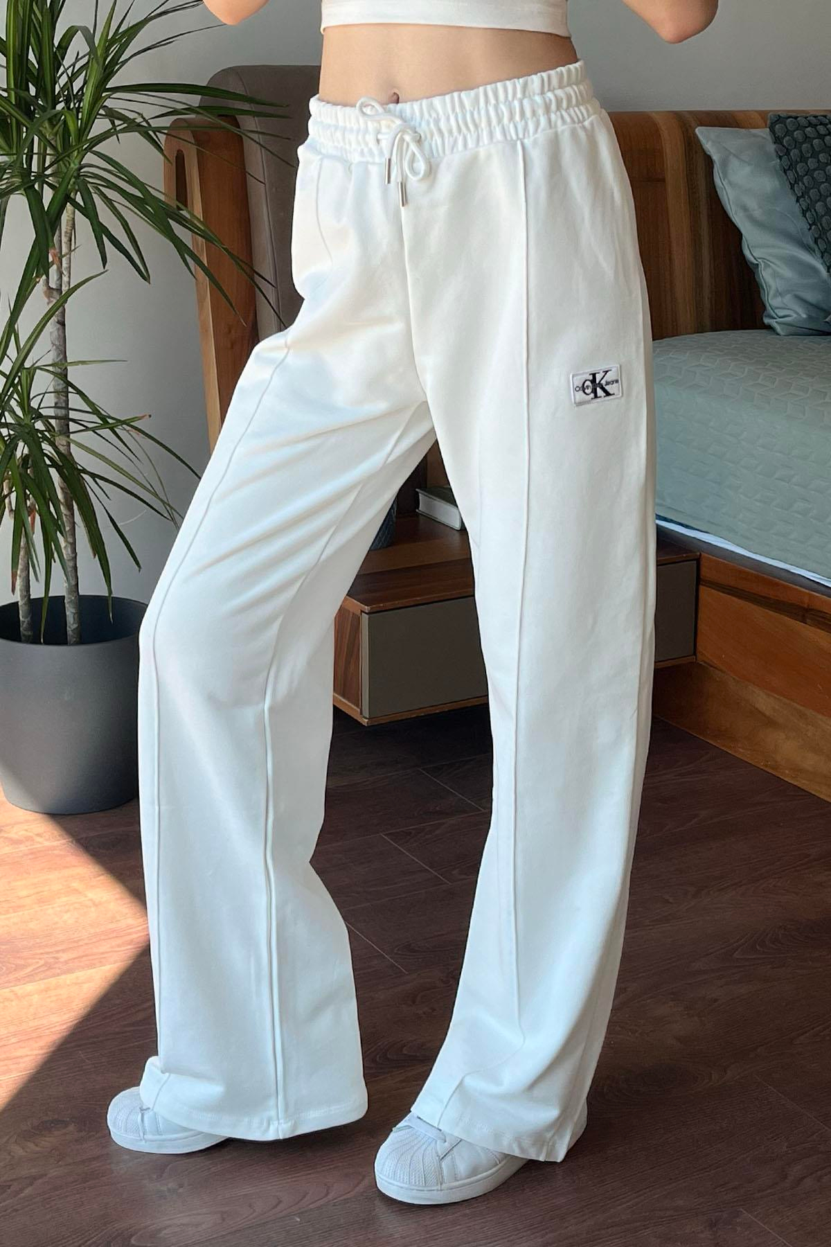 Beyaz Logo Detaylı Üç İplik Şardonsuz Palazzo Eşofman Altı