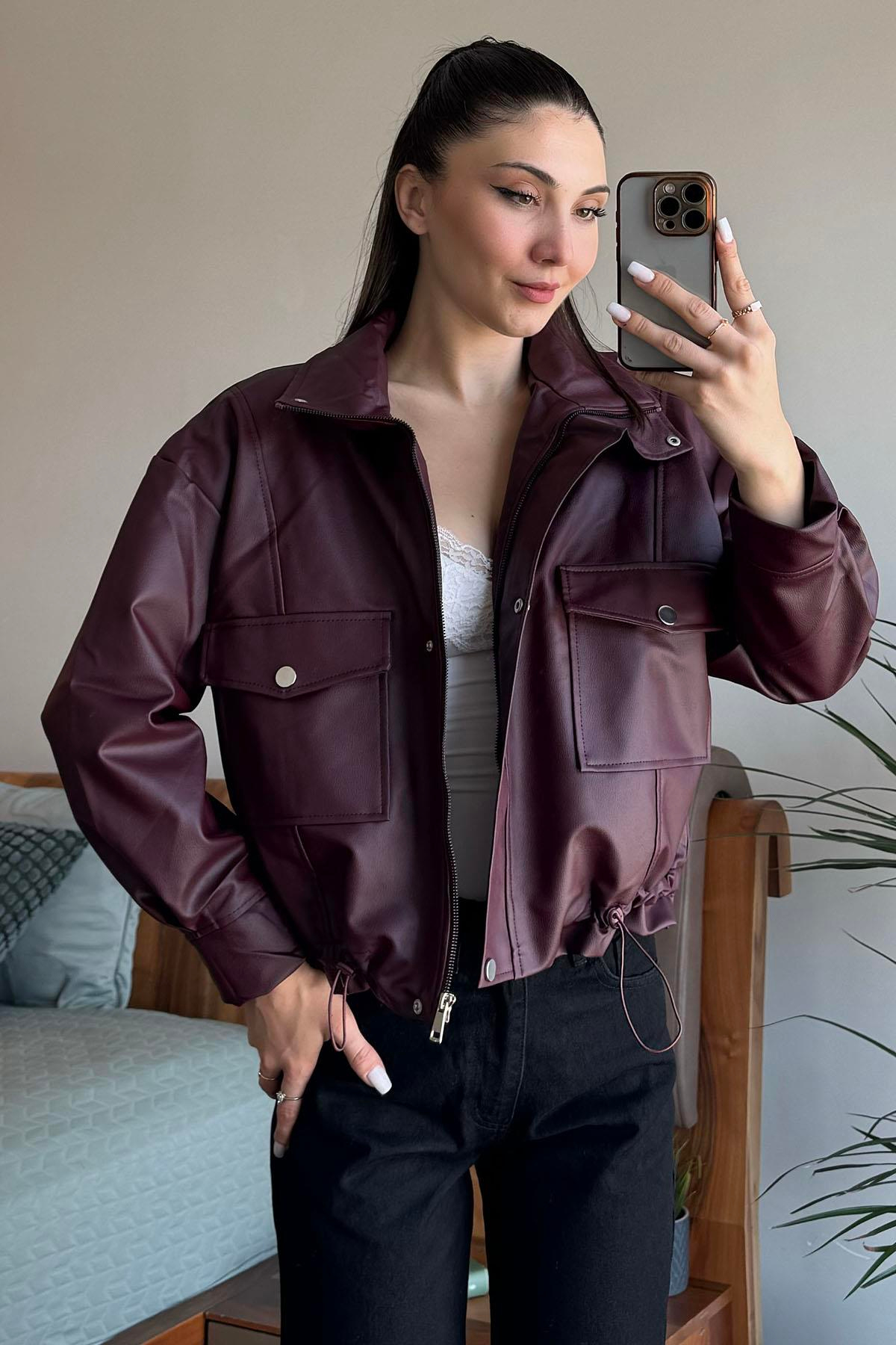 Bordo Beli Lastikli Boyfriend Deri Ceket (MBTR2142)