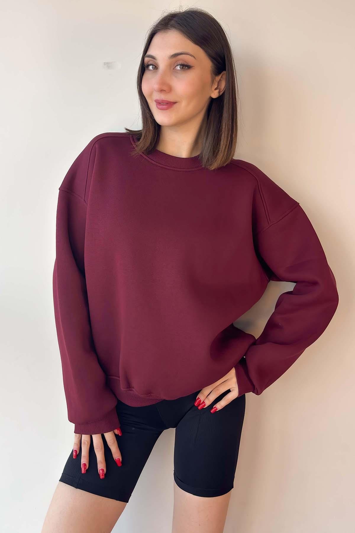 Bordo Oversize Bisiklet Yaka İçi Şardonlu Üç İplik Sweatshirt (MBTS134)