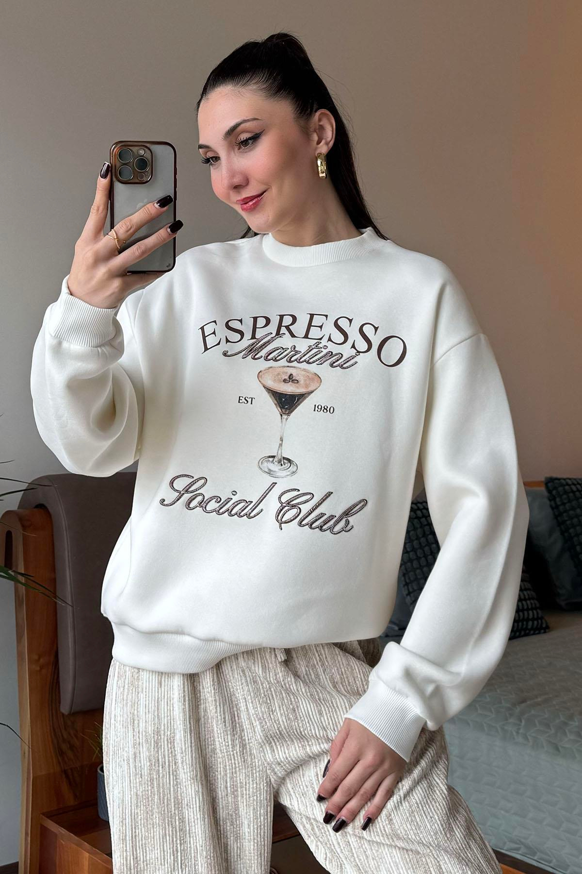 Ekru Espresso Martini Basklı Nakışlı Sweatshirt