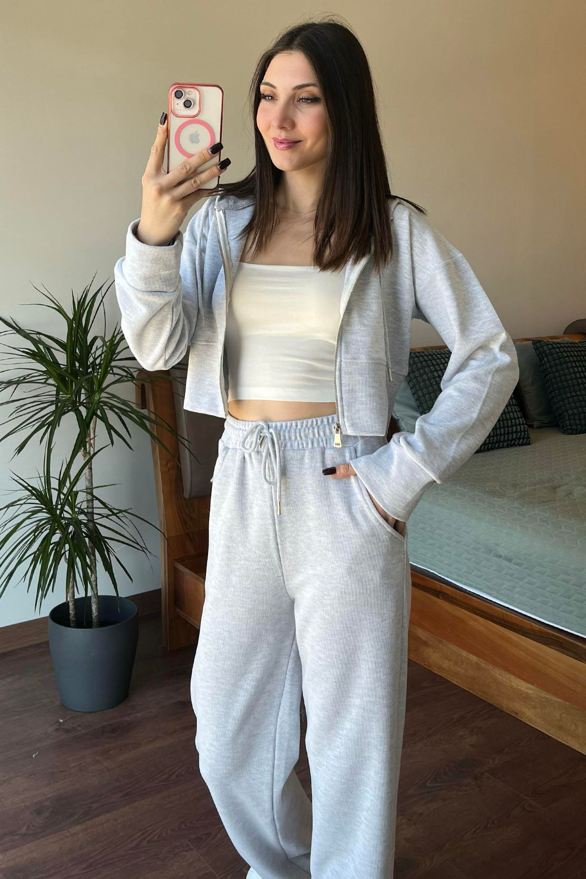 Gri Kapüşon Detaylı Crop Ceketli Takım