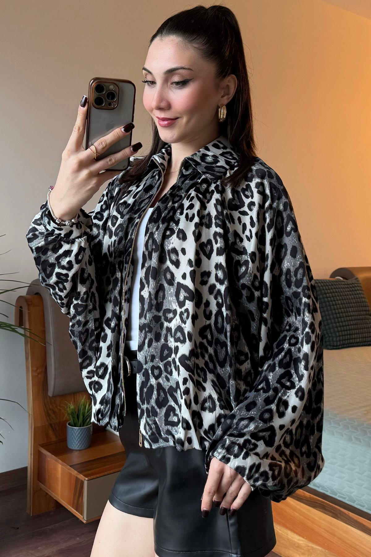 Gri Leopar Desenli Yarasa Kol Saten Ceket