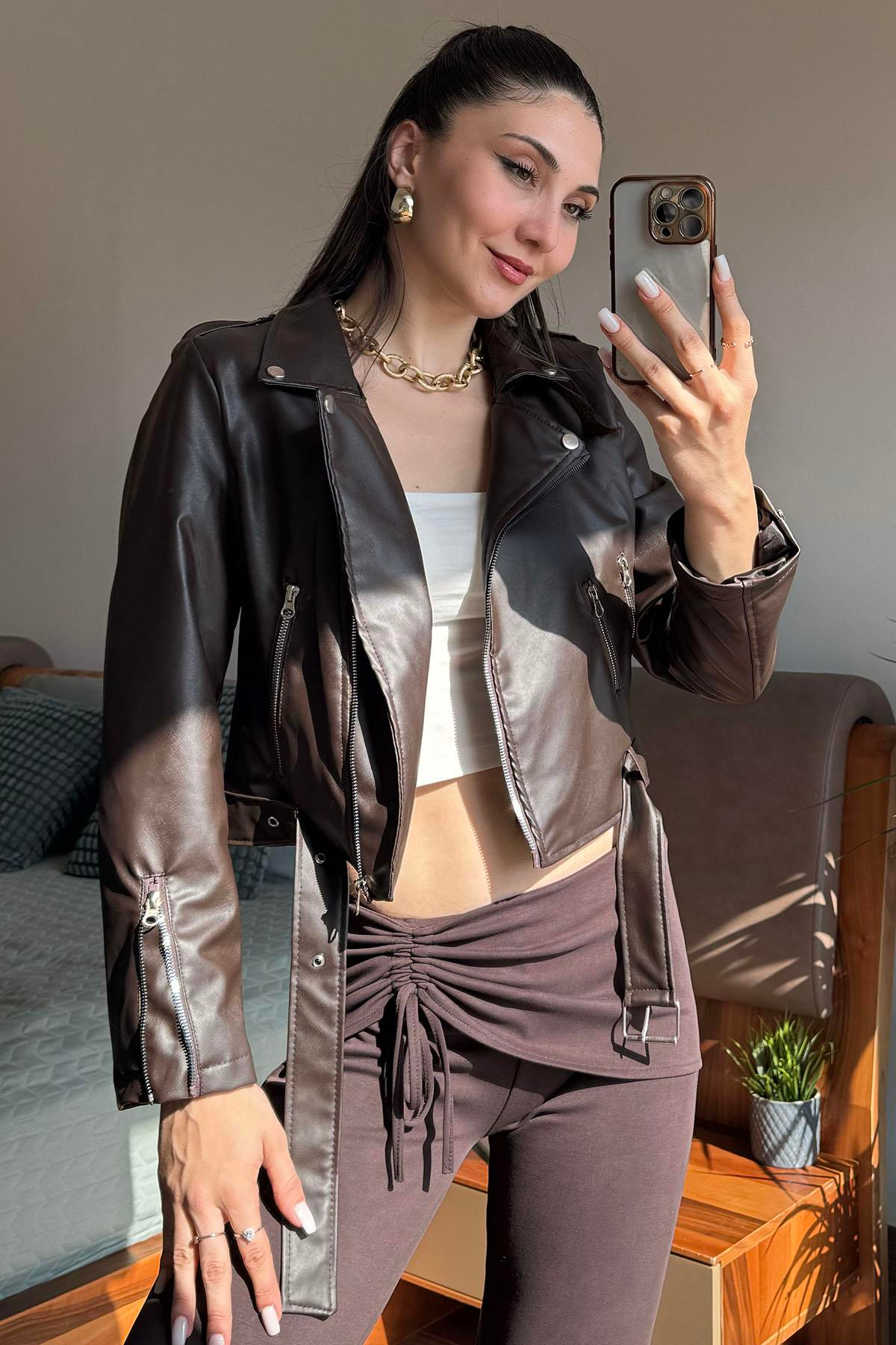 Kahverengi Fermuarlı Deri Mont