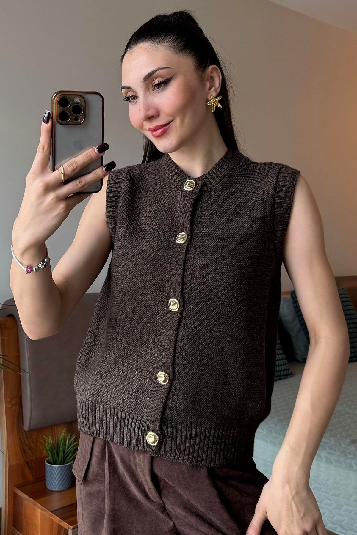 Kahverengi Gold Düğmeli Triko Yelek (MBQU251005)