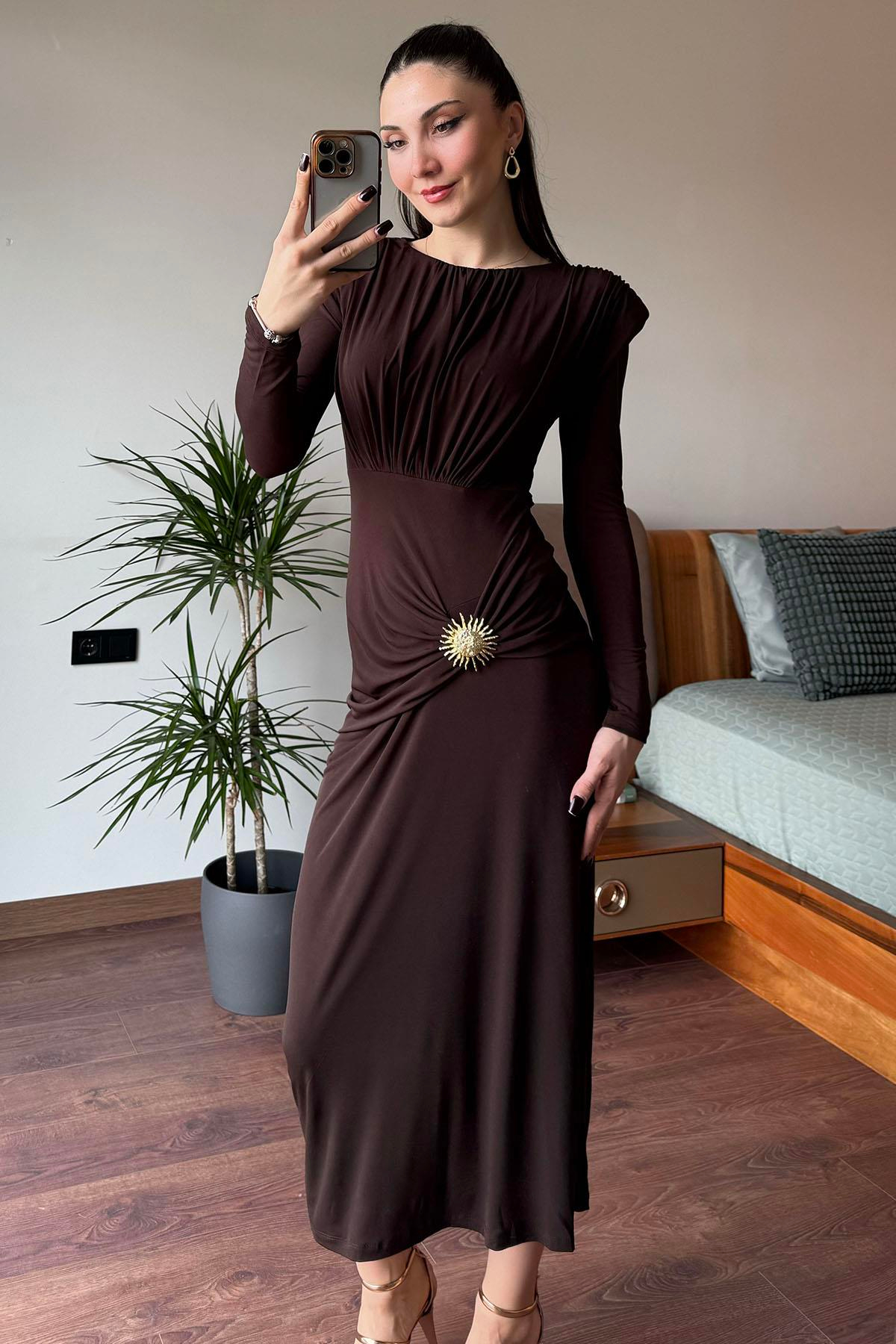 Kahverengi Güneş Tokalı Drape Detaylı Elbise