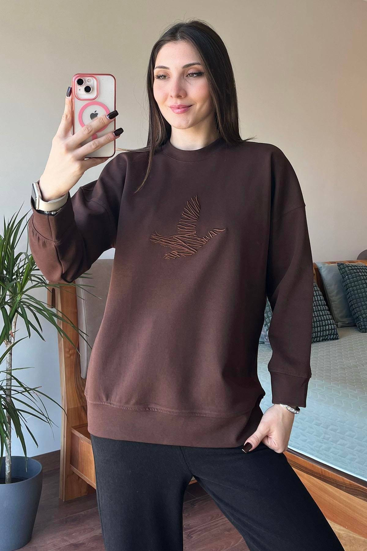 Kahverengi Kuş Nakışlı Şardonsuz Sweatshirt