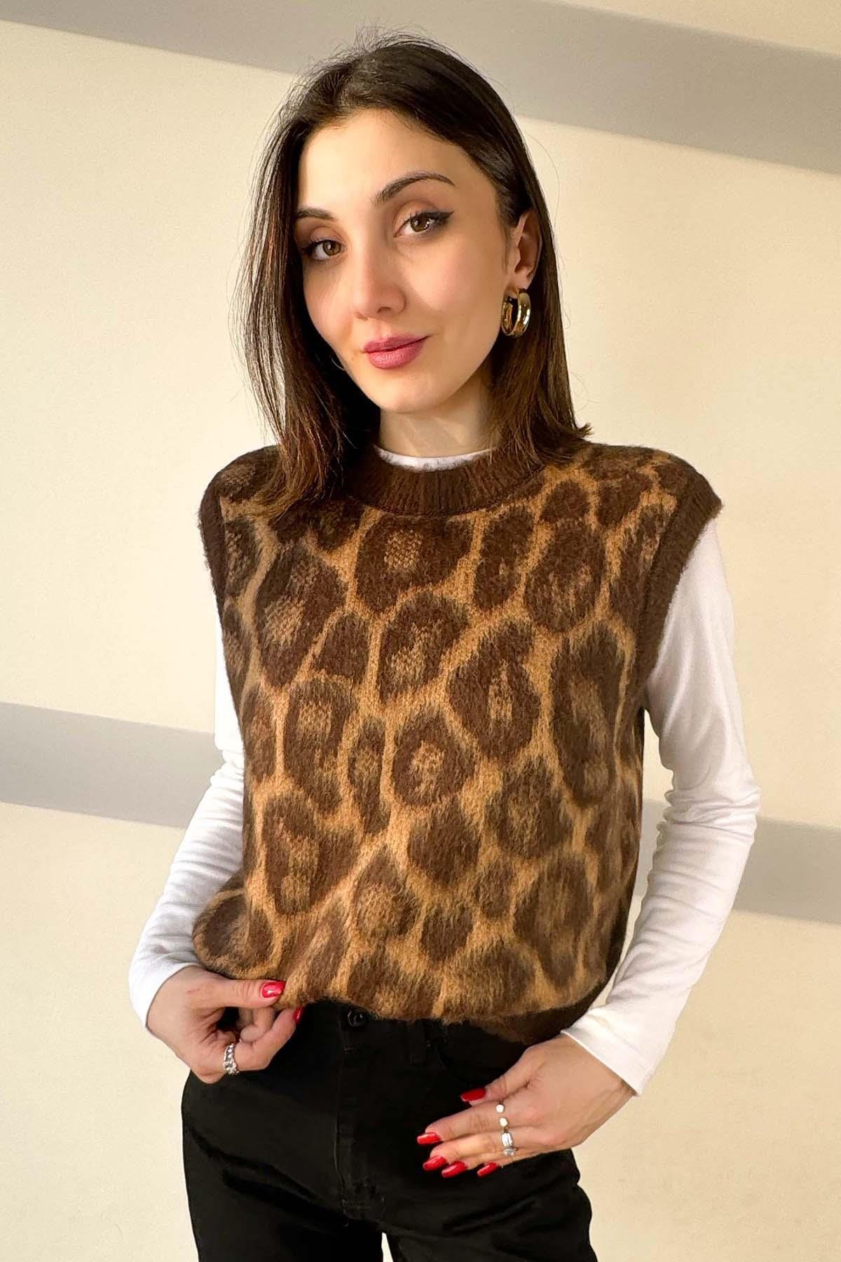 Kahverengi Leopar Desen İpek Süveter
