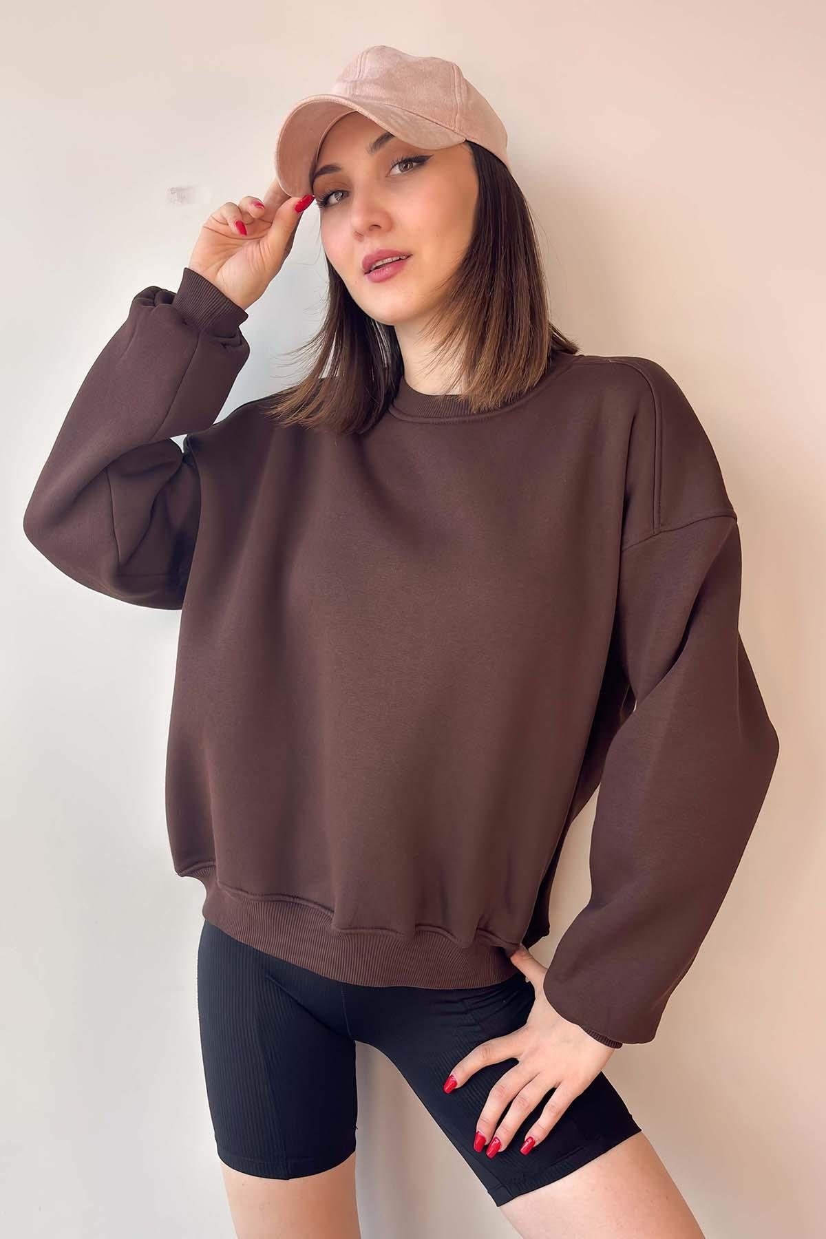 Kahverengi Oversize Bisiklet Yaka İçi Şardonlu Üç İplik Sweatshirt (MBTS134)