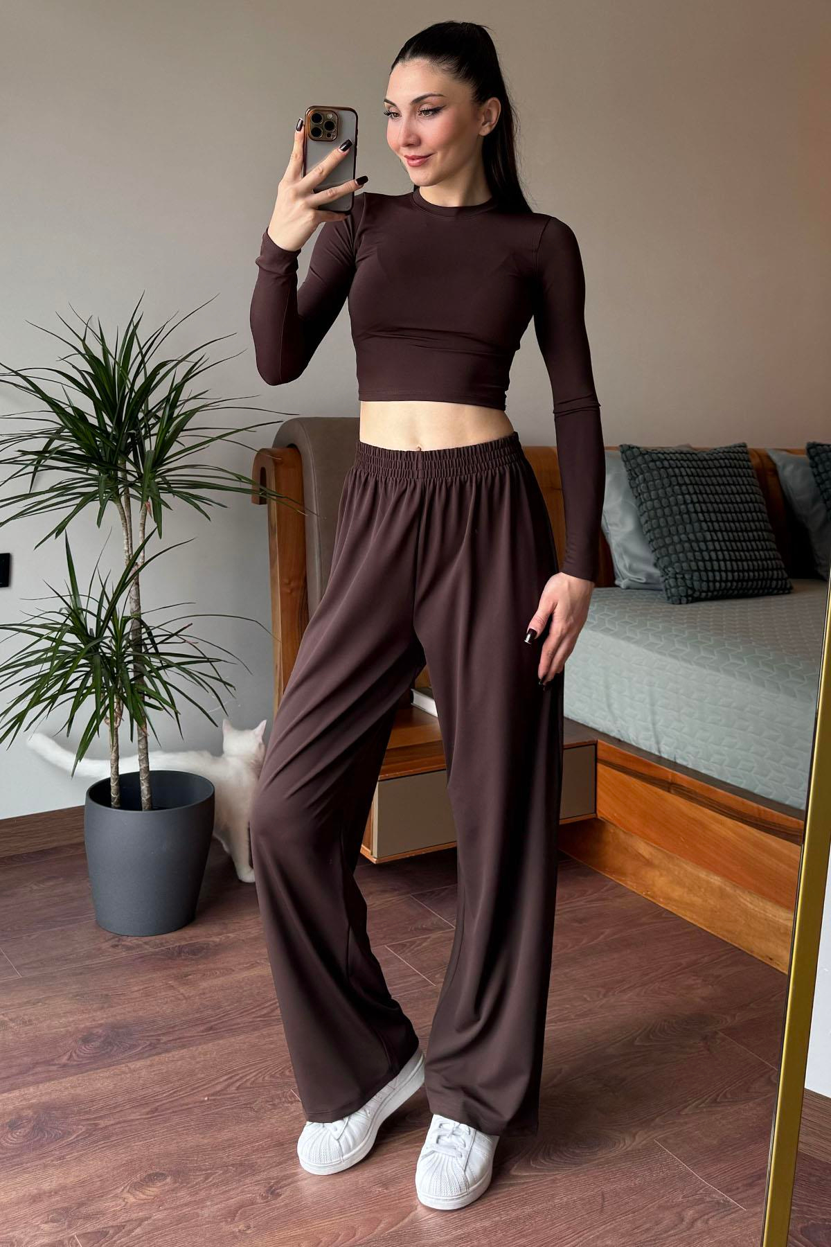 Kahverengi Uzunkollu Bol Paça Dalgıç Kumaş Takım