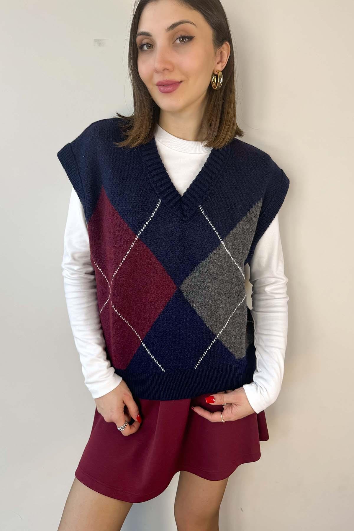 Lacivert Baklava Desen Oversize Süveter