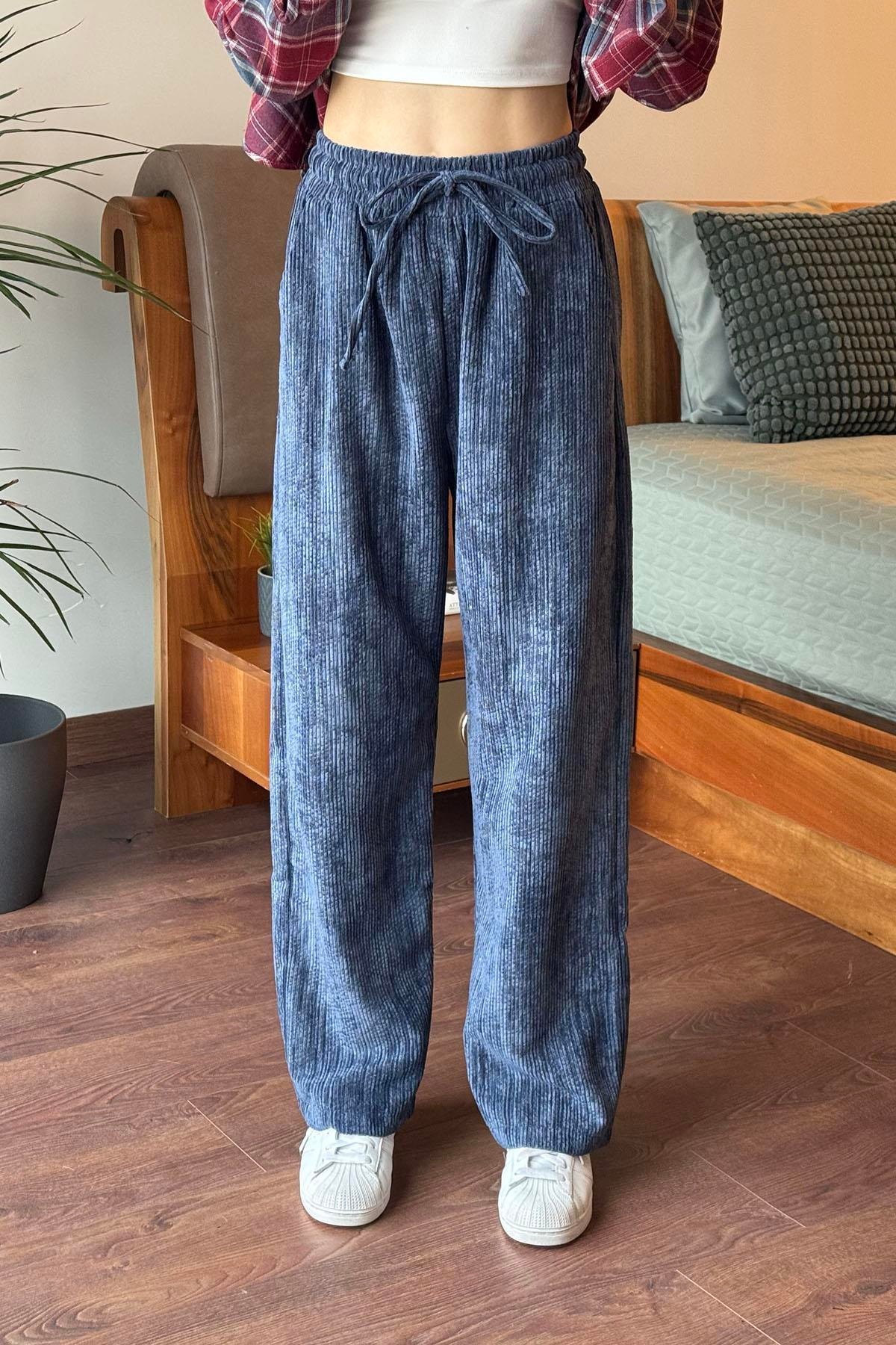 Lacivert Beli Lastikli Geniş Kesim Kadife Pantolon