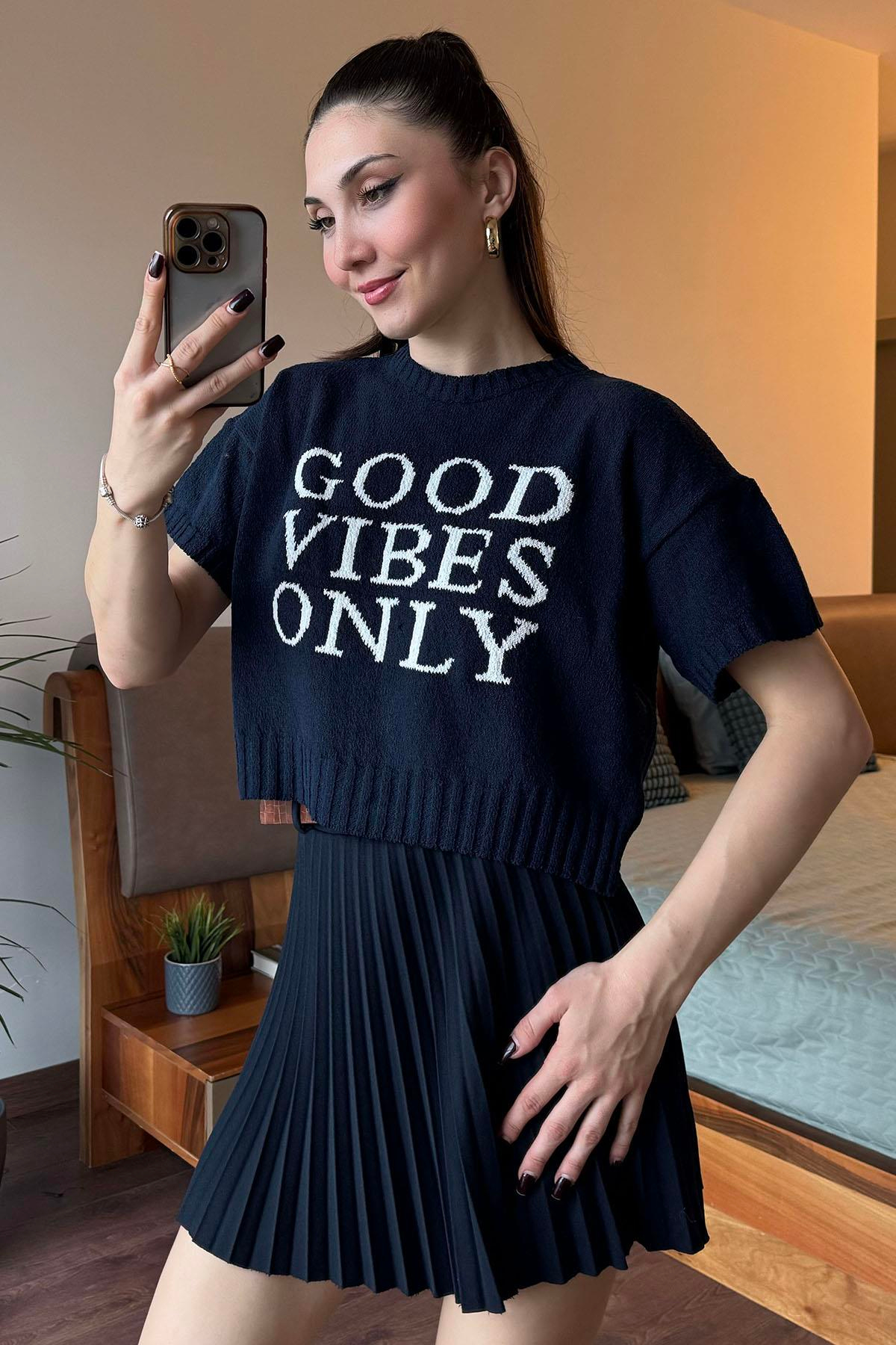 Lacivert Good Vibes Yazılı Kısakollu Triko Kazak