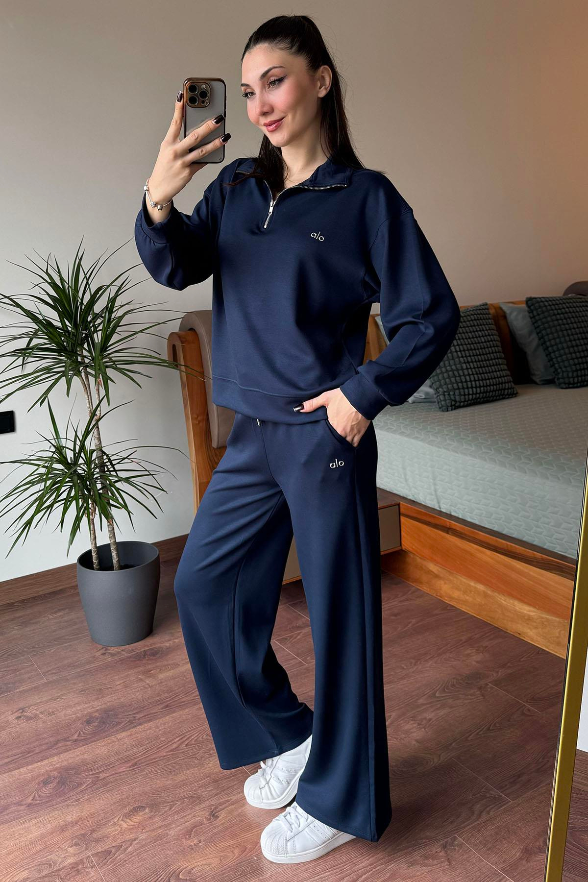 Lacivert Gümüş Yazı Detaylı Yarım Fermuarlı Kamyoner Yaka Modal Takım