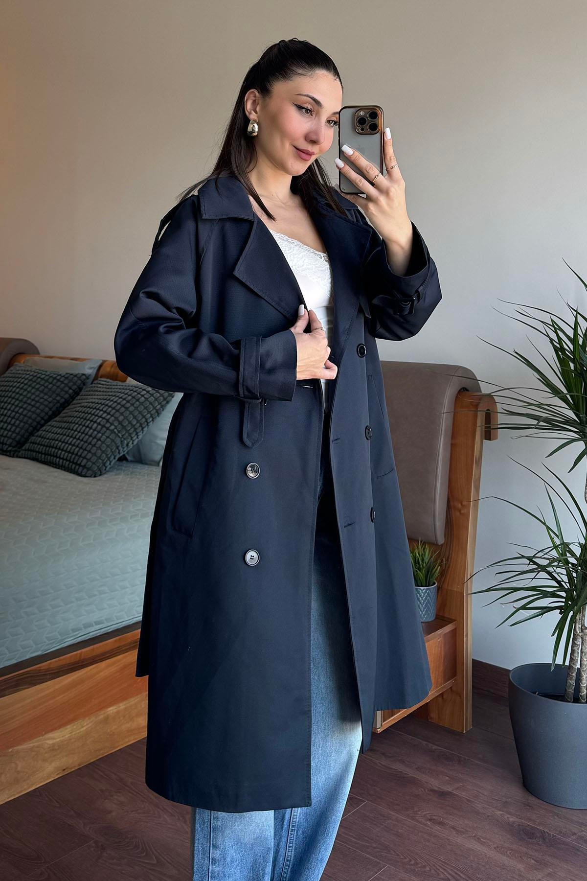 Lacivert Kruvaze Yaka Trençkot