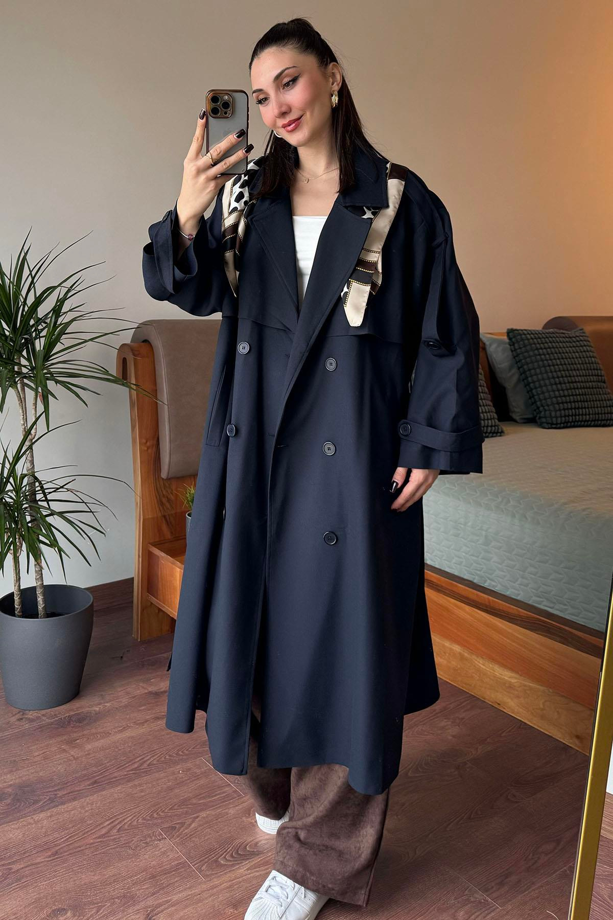 Lacivert Oversize Bezayağı Uzun Trençkot (MBTR2795)