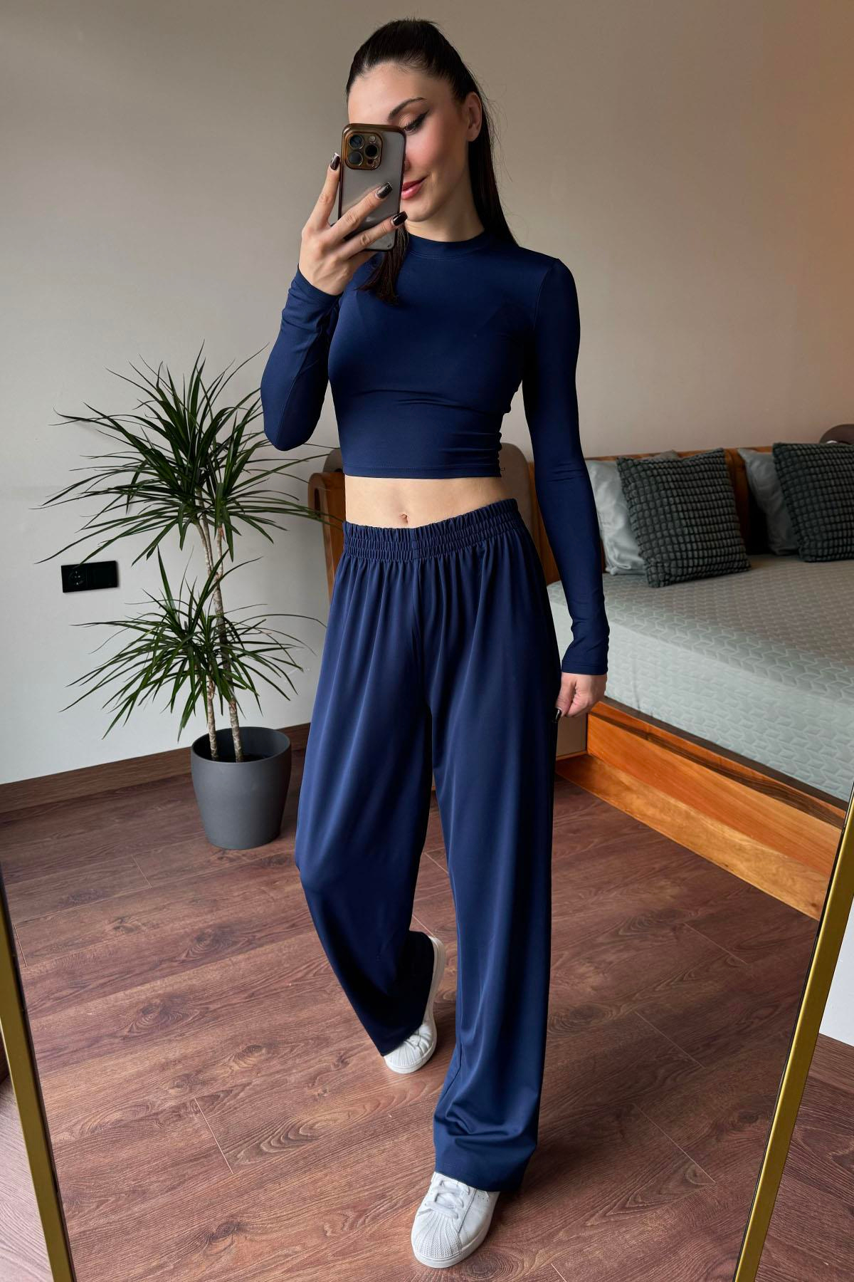 Lacivert Uzunkollu Bol Paça Dalgıç Kumaş Takım