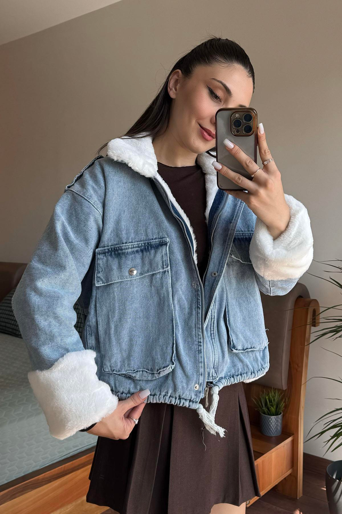 Mavi Fermuarlı Kürklü Kot Mont (MBTR2241)