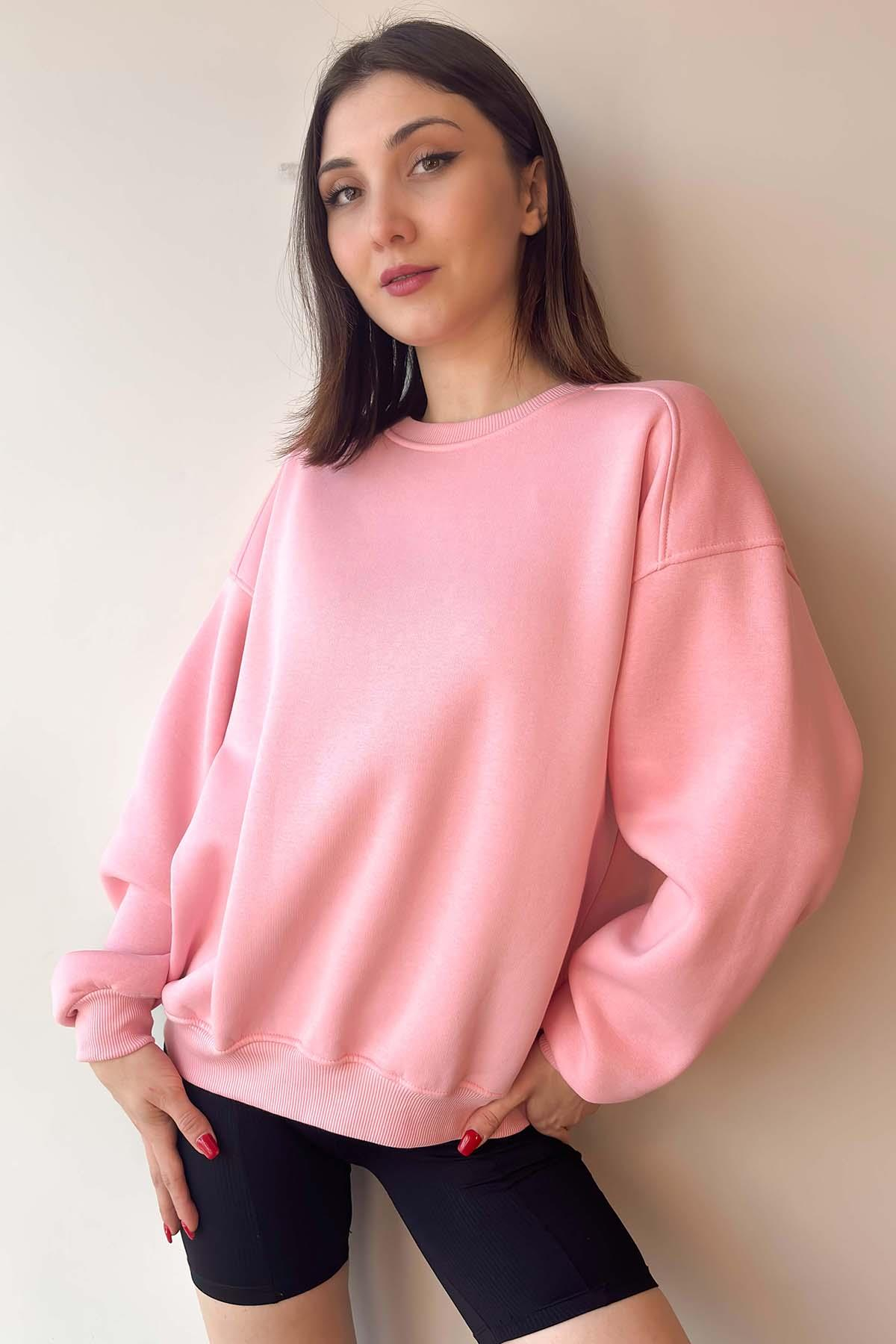 Pembe Oversize Bisiklet Yaka İçi Şardonlu Üç İplik Sweatshirt (MBTS134)