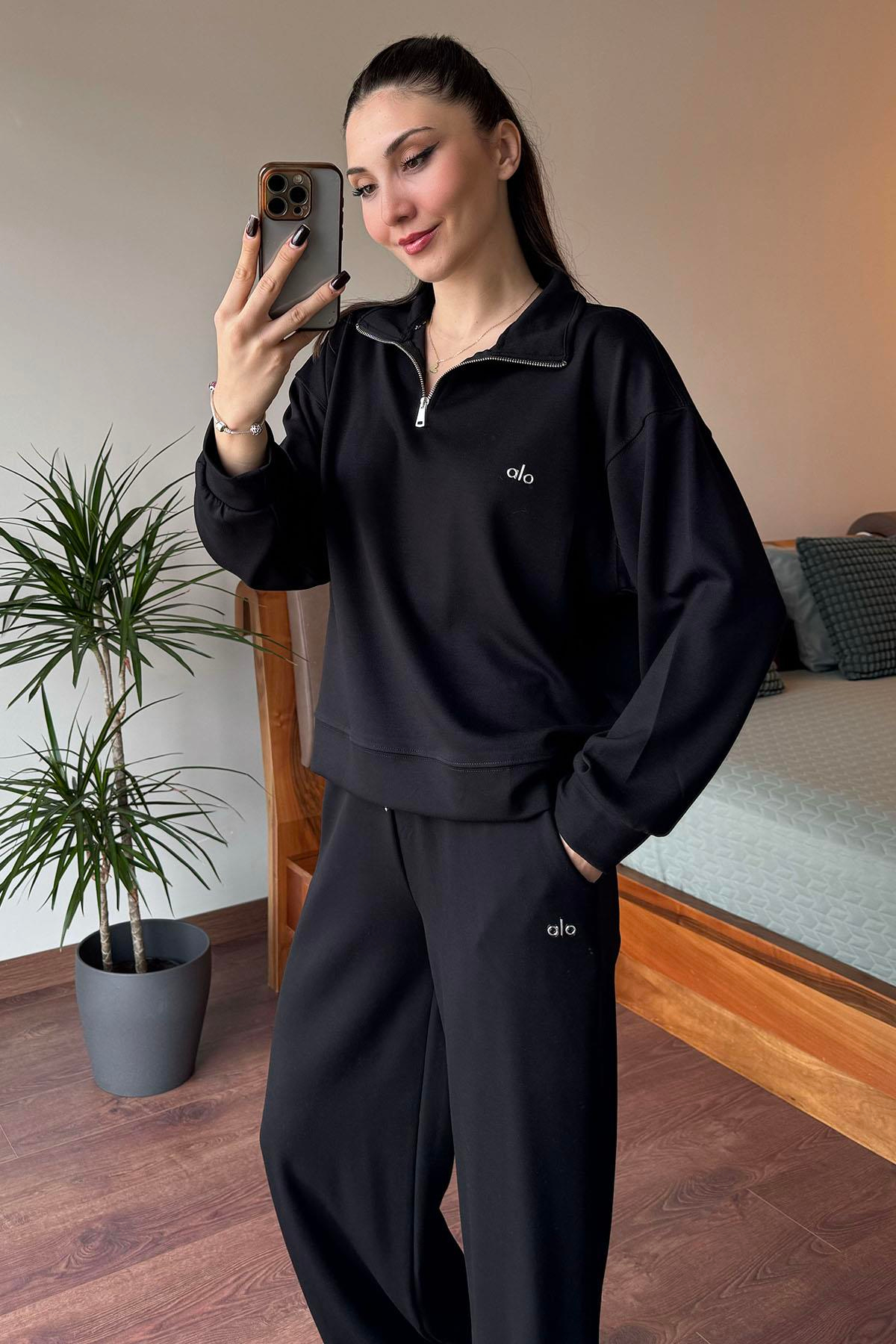 Siyah Gümüş Yazı Detaylı Yarım Fermuarlı Kamyoner Yaka Modal Takım