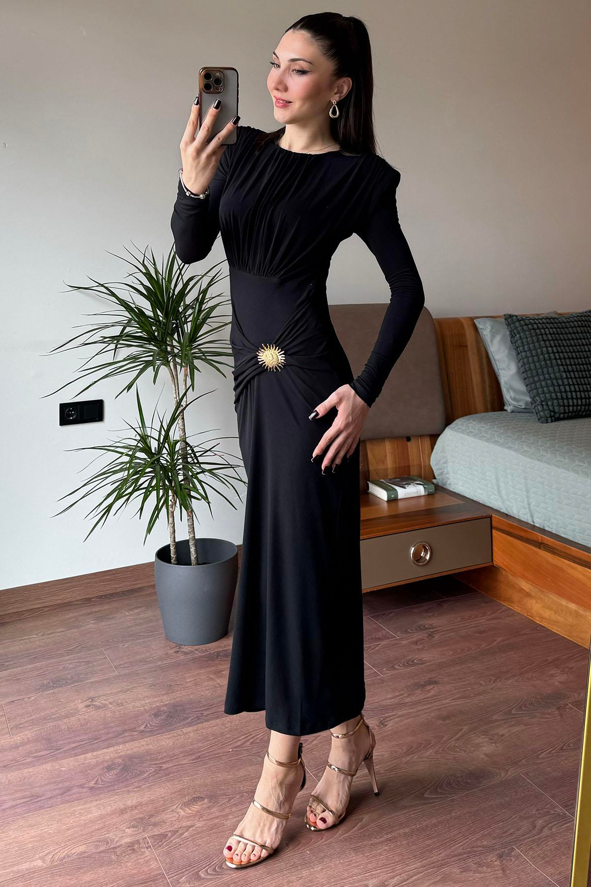 Siyah Güneş Tokalı Drape Detaylı Elbise