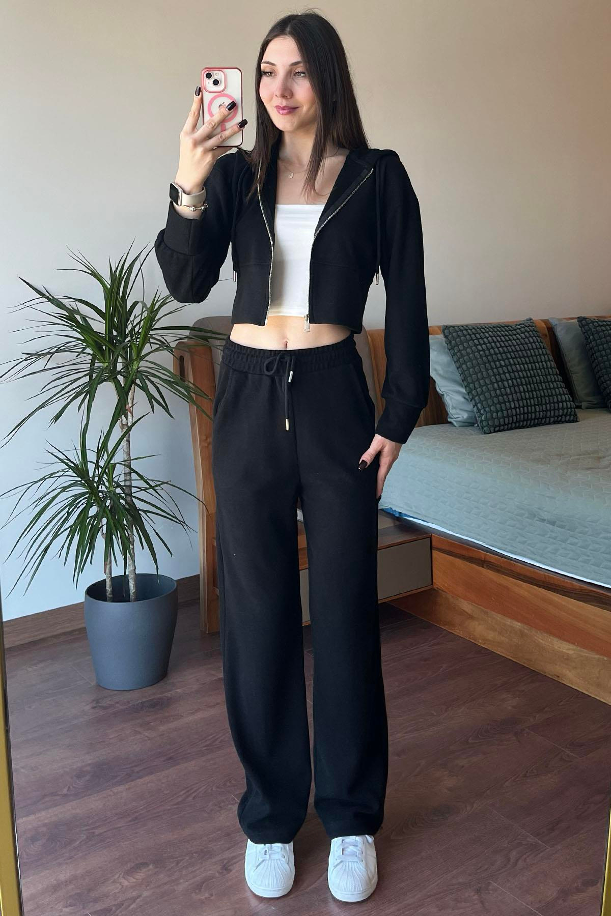 Siyah Kapüşon Detaylı Crop Ceketli Takım