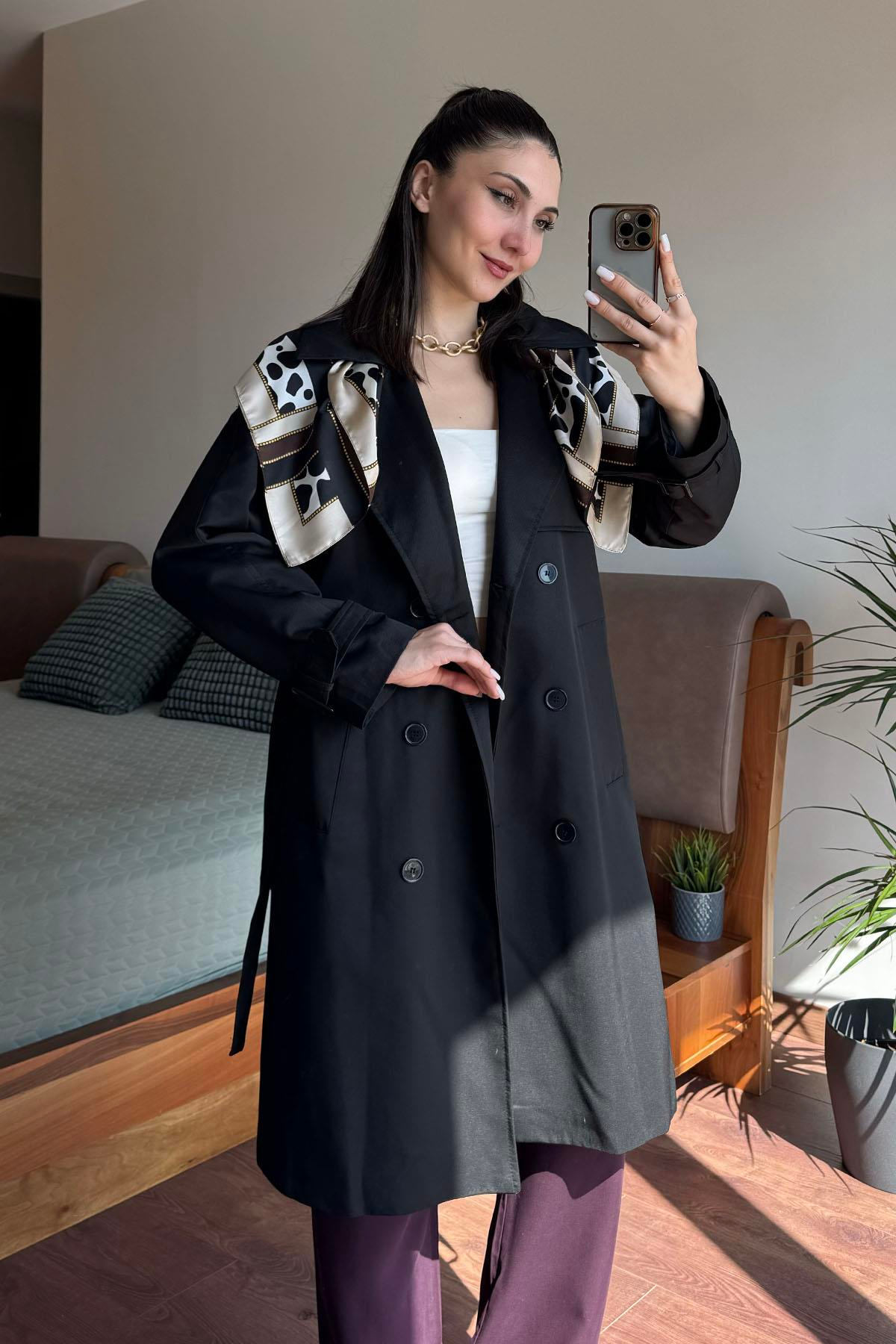 Siyah Kruvaze Yaka Trençkot (MBTR8818)
