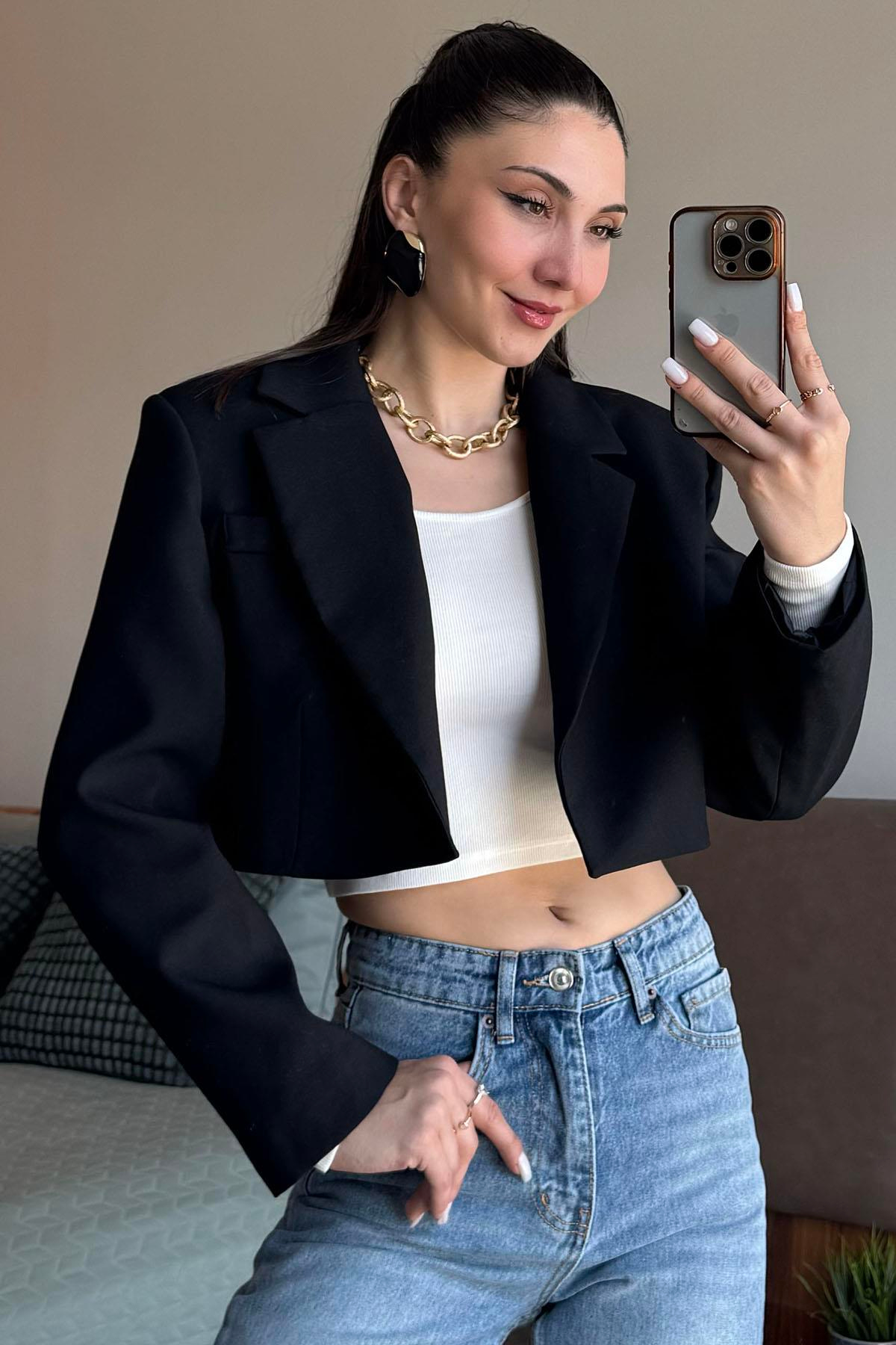 Siyah Kumaş Crop Ceket