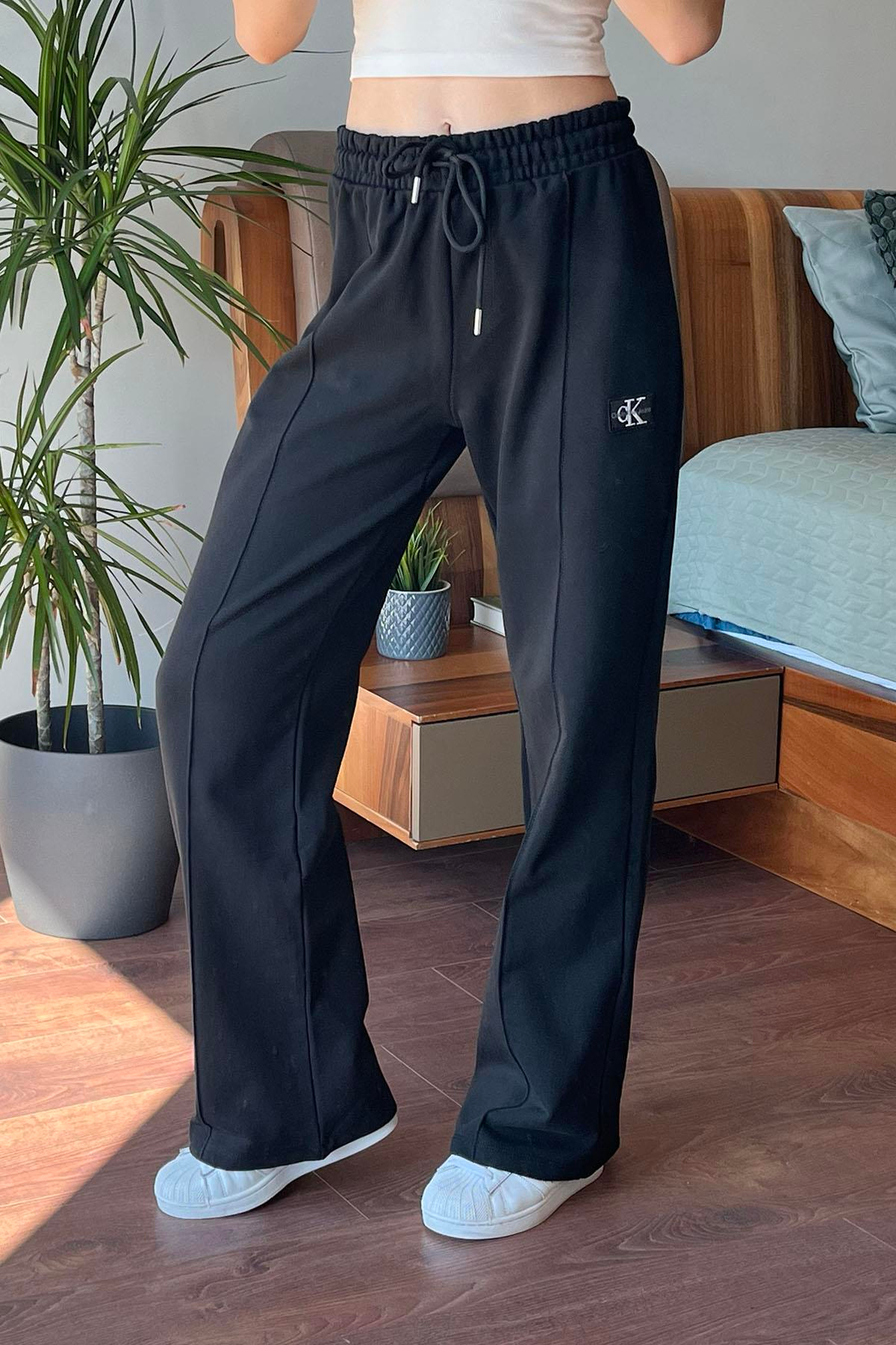 Siyah Logo Detaylı Üç İplik Şardonsuz Palazzo Eşofman Altı