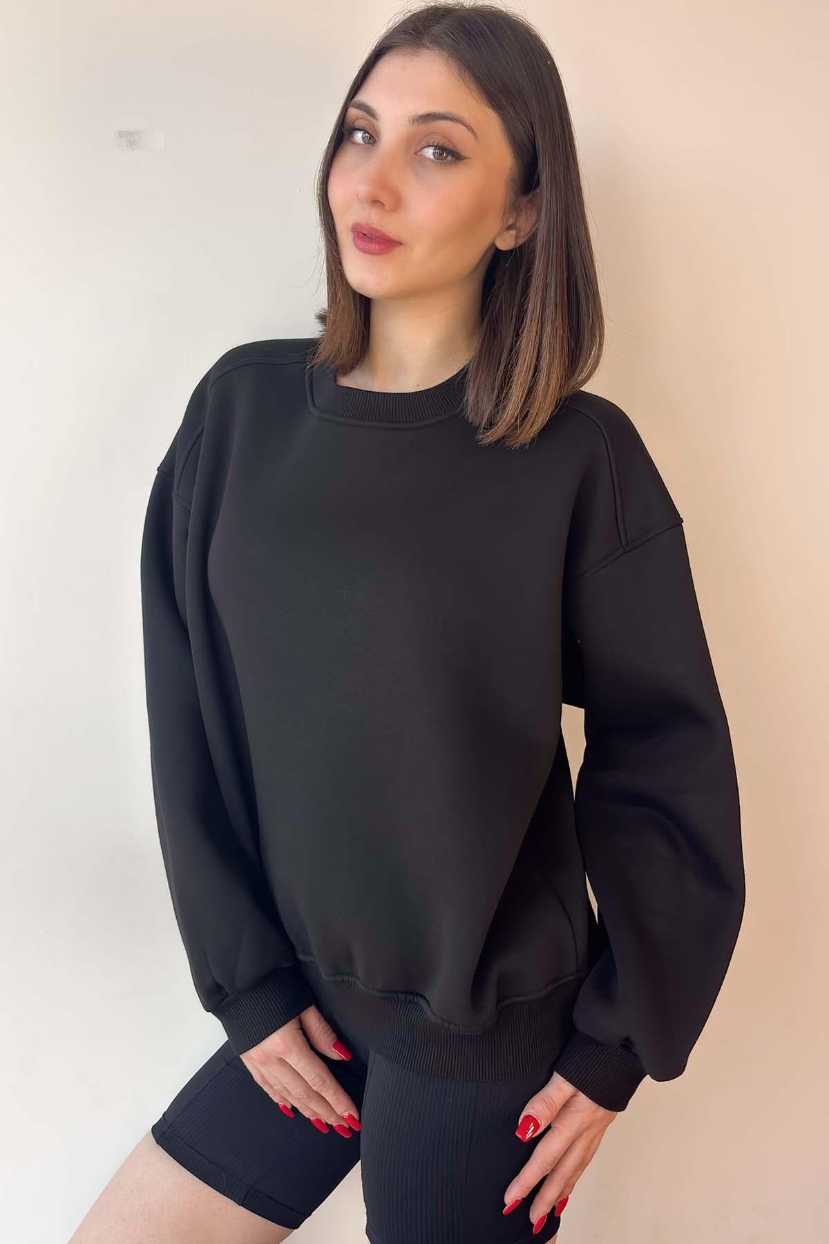 Siyah Oversize Bisiklet Yaka İçi Şardonlu Üç İplik Sweatshirt
