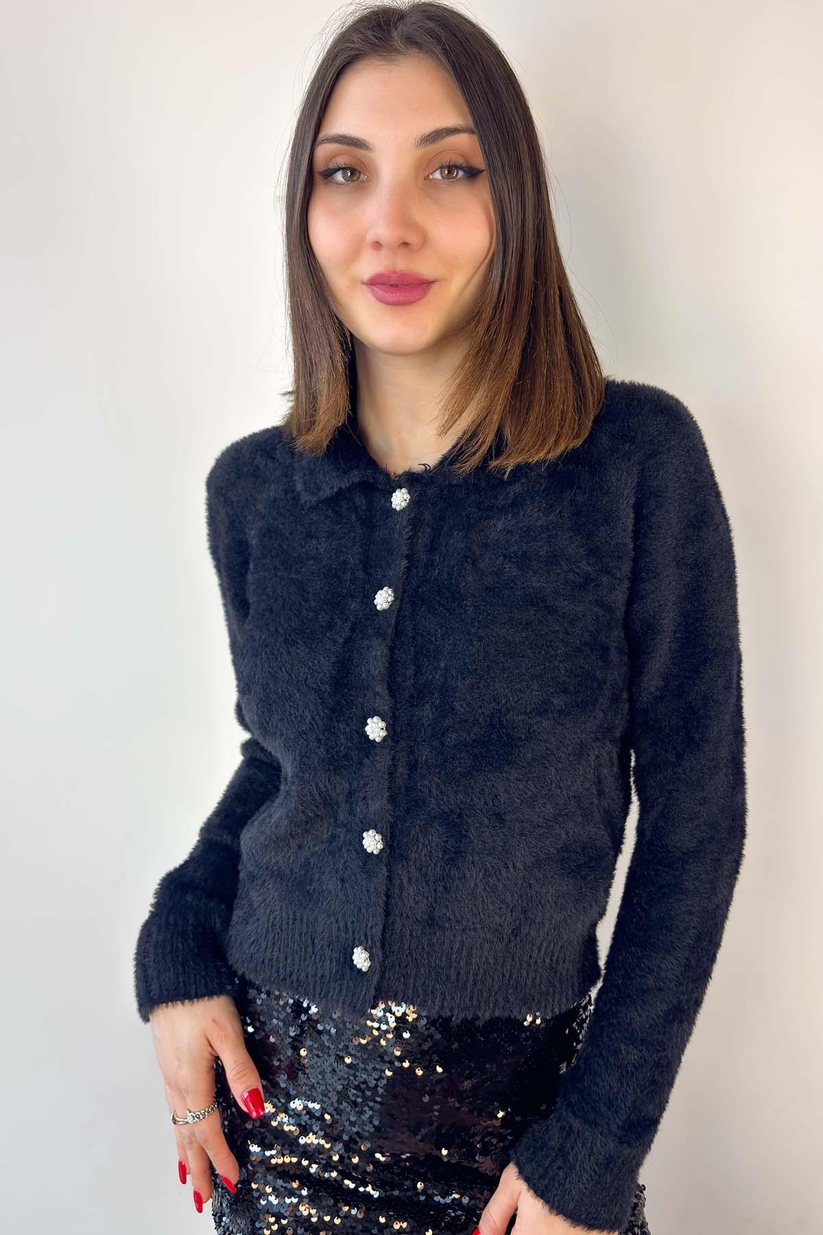 Siyah Polo Yaka İnci Düğmeli Hırka